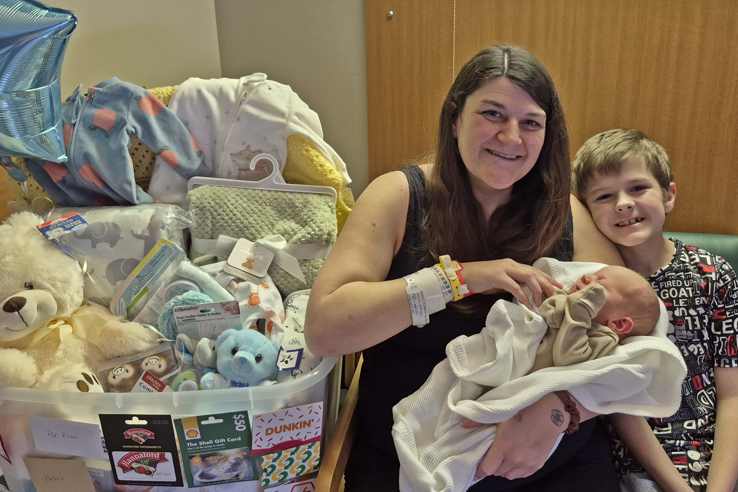 The New Year’s baby basket provided by the hospital was filled with items for the baby and gift cards for the family. Most of the items were purchased from the DECH Auxiliary Gift shop and several were donated by the Auxiliary.